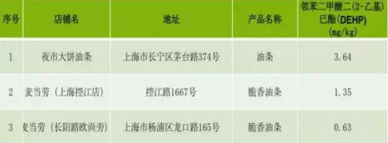 此次麦当劳上海控江店、麦当劳长阳路欧尚店的油条被查出邻苯二甲酸酯类增塑剂(DEHP,俗称塑化剂)超标,数值在0.63-3.64mg/kg之间。世卫对塑化剂DEHP规定的每日耐受摄入量为0.025g/kg,国家卫计委出台的临时限量值为1.5mg/kg。大量摄入塑化剂可能干扰内分泌,影响生殖和发育。4日晚间,麦当劳回应称,麦当劳餐厅售卖的油条及其包装在生产过程中没添加任何塑化剂,正进一步排查油条被测出塑化剂的原因。
