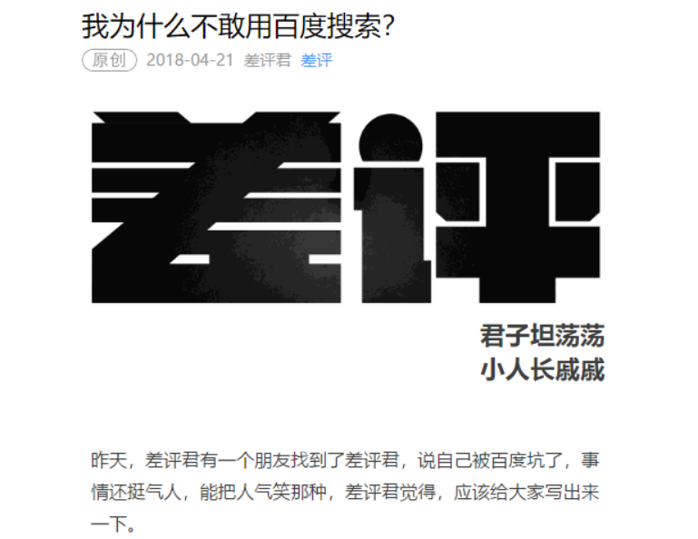 4月21日凌晨,科技自媒体@差评君 在其微信公众号上发布了一篇文章《我为什么不敢用百度搜索?》,此文在朋友圈广为流传,阅读量10万+。文章说,有网友称自己被“百度坑了”。这位网友在手机上百度搜索“德邦物流”,排名第一的是所谓的“德邦物流”的“官网”,他拨打电话并下单,结果收到物流时才发现,发货的并不是“德邦”,而是一家山寨物流公司。