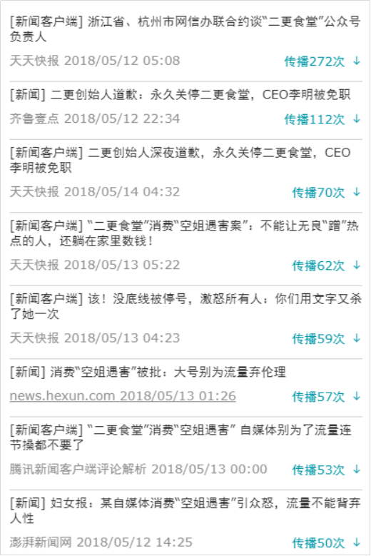 传播次数较多的文章除了前三篇是“二更食堂因不当言论关停”事件的相关报道。之后的文章都在谴责二更食堂,“不能让无良‘蹭’热点的人,还躺在家里数钱”,“你们用文字又杀了她一次”,“大号别为流量弃伦理”,“别为了流量连节操都不要了”。仅从标题就可以看出,二更食堂这一篇文章究竟是有多让人反感了。