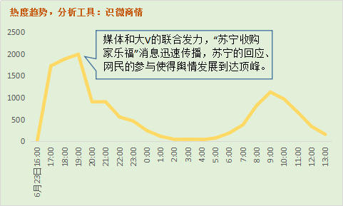 除了参与传播该消息外,媒体迅速对苏宁收购家乐福背后的原因进行跟进报道,以期让受众全面了解苏宁这一行为。媒体的解读使得舆情在24日到达次高峰。