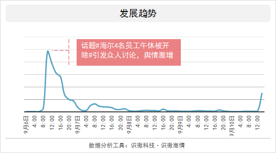 海尔4名员工因午休被开除的消息在网上发酵后,谴责海尔集团的讨论量迅速增加,关于企业人性化管理话题也迅速获得关注。