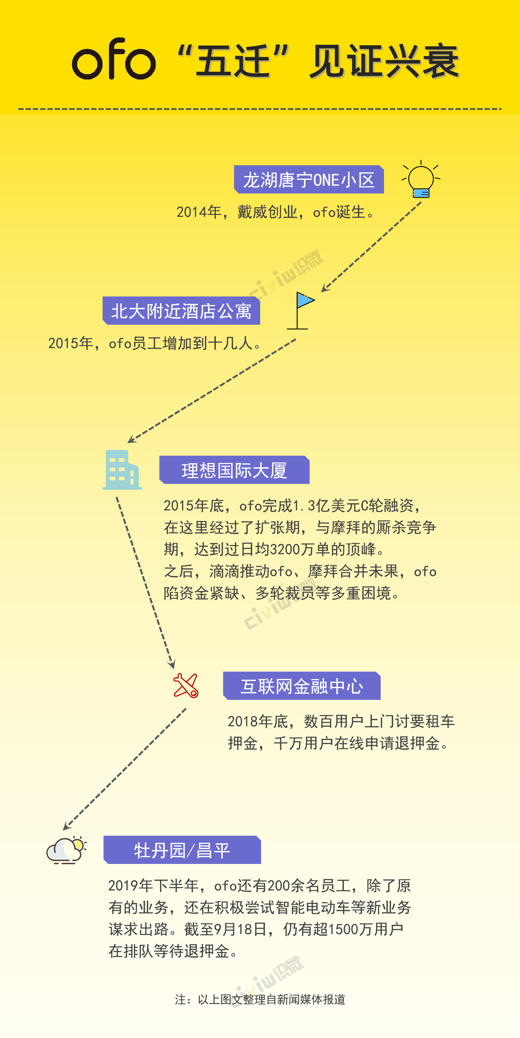 自去年小黄车ofo爆发千万人排队退押金之后,就鲜有再有消息传出,关注度如同当前的境况一样低迷。近日,有媒体爆出ofo搬离了互联网企业云集中关村,甚至连去向都没有对外公开披露。从2014年创立至今,这已是ofo第五次搬家。