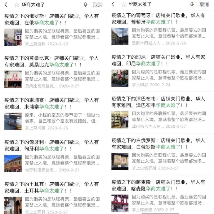 近日,微信出手封了50个违规公众号。据报道,2月27日至3月16日,“掌上瑞士”“掌上白俄罗斯”“掌上印度”“掌上都柏林”等60多个微信公众号批量发布雷同的标题和文章,以华人口吻讲述“国外疫情下的困境”。标题大多为“疫情之下的某某国:店铺关门歇业,华商太难了!”