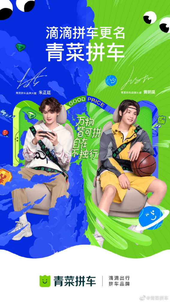 7月20日,滴滴拼车宣布更名为“青菜拼车”,采用全新品牌标识,邀请明星朱正廷、黄明昊担任新品牌大使。