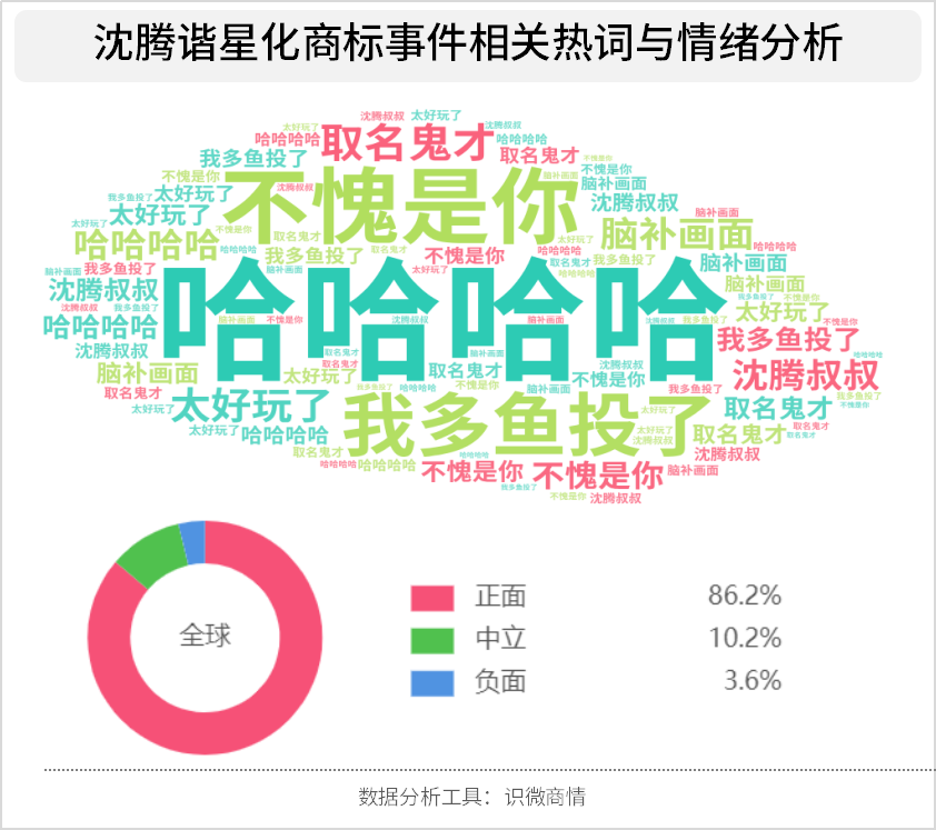 或许是大家第一次接触企业的这种搞笑,又或者是沈腾的开头让网友开始习惯。数据显示,网友对于蒙牛注册“可牛了”一事正面性情绪更高,到达了90%以上。随后我们可以看到诸多企业在短短几天内被曝出各种不正经的商标注册。而这种行为也受到了网友各种欢乐的评价,哈哈哈你怎么也变成这样了。