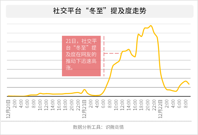 以冬至为例,网友在讨论什么,无疑是冬至吃饺子/汤圆。根据识微商情数据统计,在冬至的相关提及中,冬至吃饺子的提及度占据到了冬至的话题热度的半壁江山。在21日上午之前,冬至吃饺子的话题基本随着冬至走。企业与其祝你幸福,不如让企业营销人员在社交平台、朋友圈以图文并茂的方式多发点诱人的饺子,告诉消费者要如何吃饺子吃出仪式感来,这更能让消费者记住你。