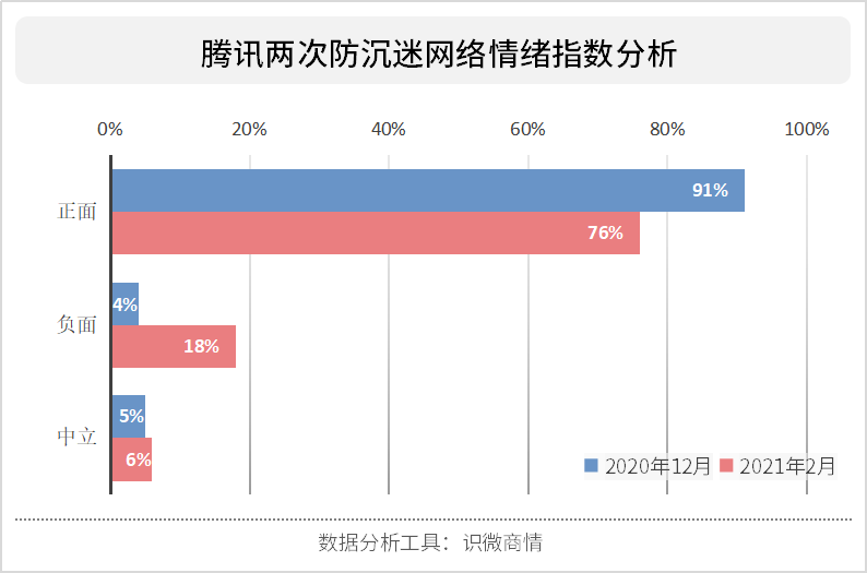 从这两次举措的结果而言,腾讯在网络上所受到的评价基本还不错,整体情绪指数呈正面。但我们也可以看到,2月近期腾讯最新的防沉迷技术新闻所收到的负面性反馈更多,负面性情绪发言占据到总量的18%。