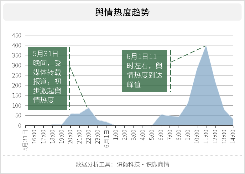 5月31日晚间,国内媒体对此进行了转载报道,并初步激发了小范围的舆情热度;随着6月1日晨间的到来,冷却的舆情热度逐渐回温,并于11时左右达至峰值,随后下降。
