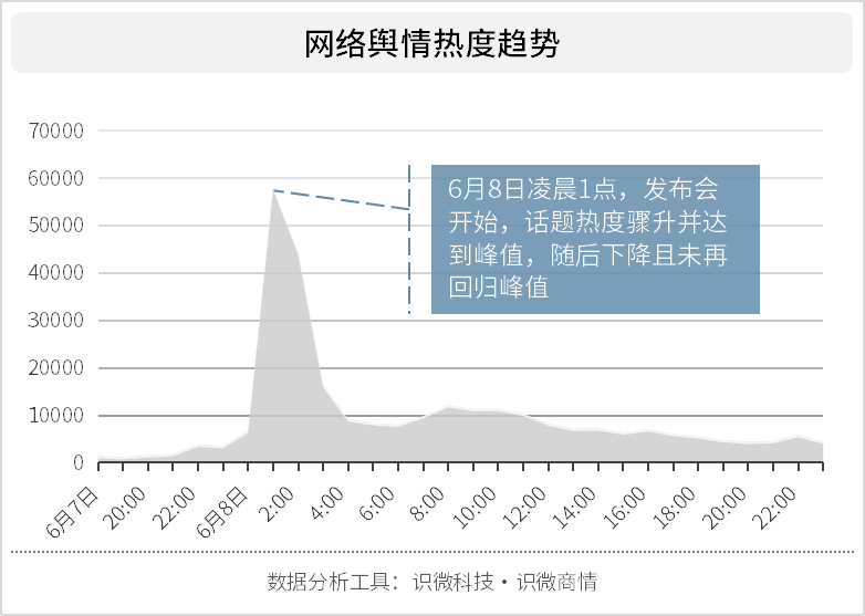 恰巧6月2日华为正式发布了鸿蒙系统,或是怀着些比较的心态,网友们对苹果此次开发者大会的热情更甚。虽然演讲开始时间在凌晨一点,但不少人愿意为之熬夜等候,舆情热度骤升;但此次WWDC的话题后劲似有些不足,虽然后续仍具有较长期的热度延续,但并未能再度回归峰值。