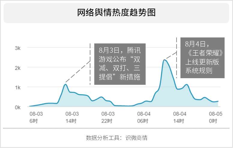 8月4日,作为腾讯“双减、双打”新措施试点的《王者荣耀》便已正式上线了更新规则,腾讯这般快速的行动力和果决的限制措施,让其相关动作让舆情热度迅攀高峰,且超过了前一日。
