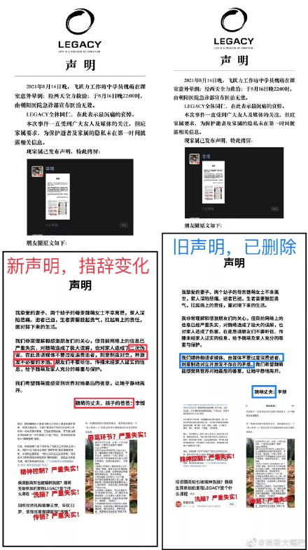 8月17日22时许,涉事的“北京诚泉文化发展有限公司”官方微信公号“LEGACY诚泉北京”发布声明和讣告,称有关媒体和自媒体提到的“精神控制”、“洗脑”、“辱骂”等内容严重失实,对逝者家属、“LEGACY”及学员造成很大伤害。一个多小时后,“LEGACY诚泉北京”删除了该声明,并重新在8月18日凌晨发布新声明,新增了关于对“传销”指控不实的截图。