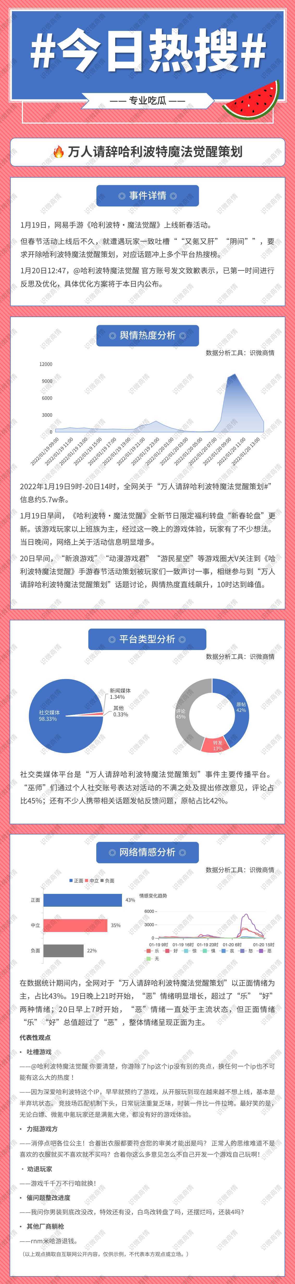 2022年1月19日9时-20日14时,全网关于“万人请辞哈利波特魔法觉醒策划#”信息约5.7w条。