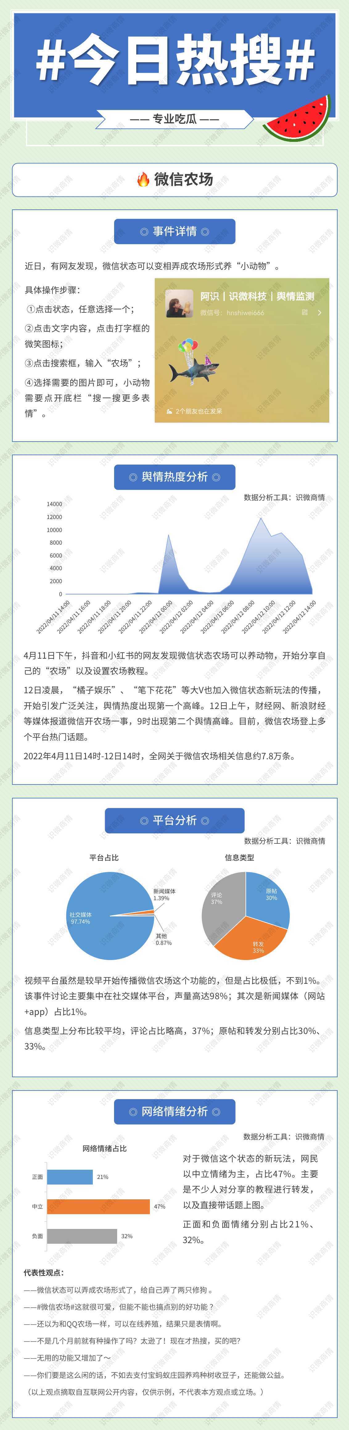 2022年4月11日14时-12日14时,全网关于微信农场相关信息约7.8万条。