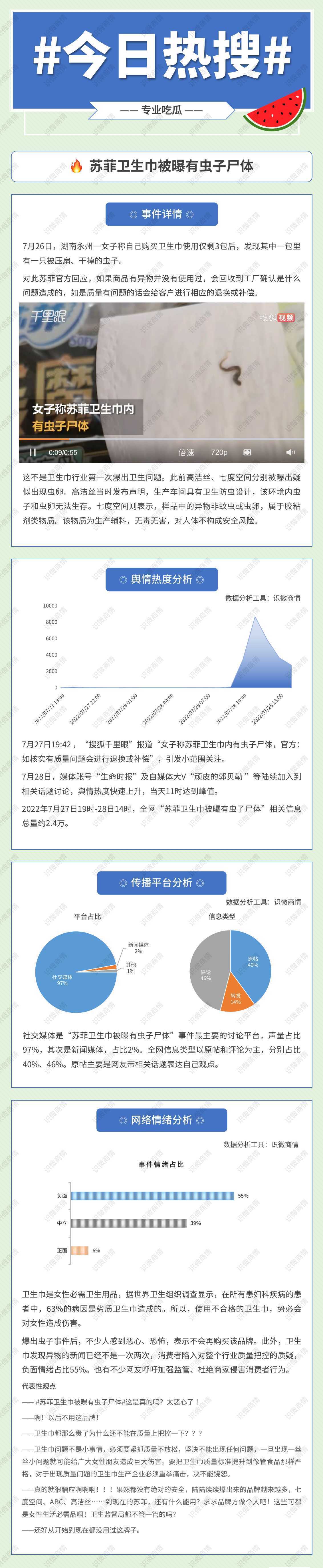 7月27日19:42 ,“搜狐千里眼”报道“女子称苏菲卫生巾内有虫子尸体,官方:如核实有质量问题会进行退换或补偿”,引发小范围关注。