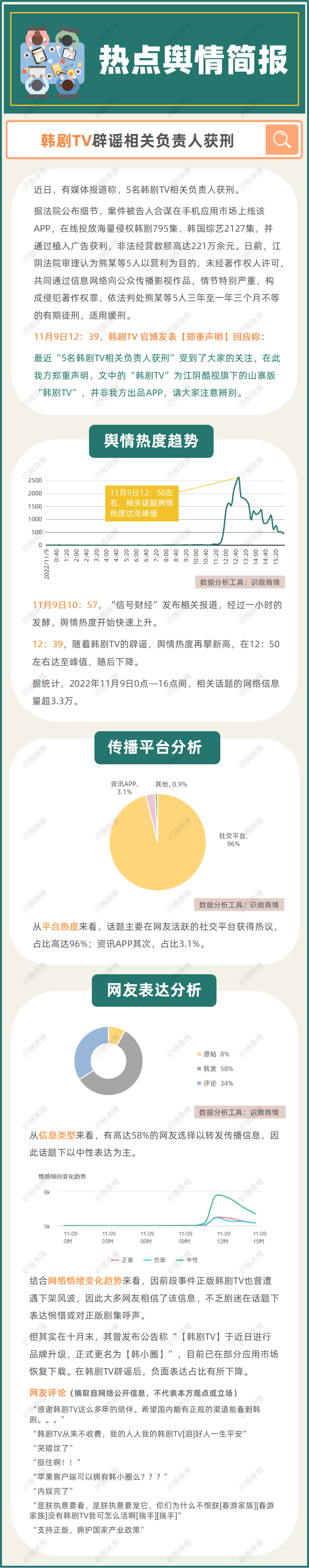 从信息类型来看,有高达58%的网友选择以转发传播信息,因此话题下以中性表达为主。结合网络情绪变化趋势来看,因前段事件正版韩剧TV也曾遭遇下架风波,因此大多网友相信了该信息,不乏剧迷在话题下表达惋惜。但其实在十月末,其曾发布公告称“【韩剧TV】于近日进行品牌升级,正式更名为【韩小圈】”,目前已在部分应用市场恢复下载。在韩剧TV辟谣后,负面表达占比有所下降。