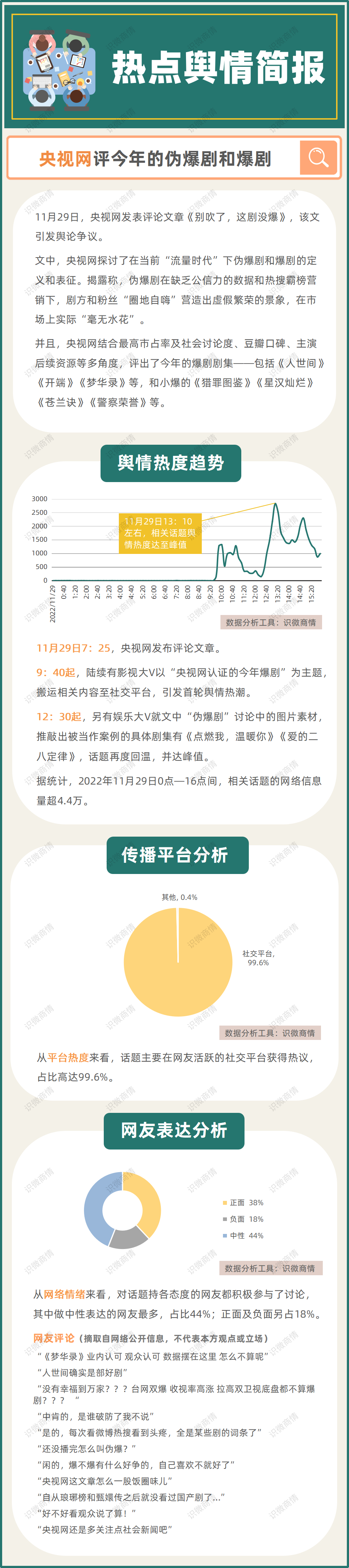 据识微商情网络舆情监测系统统计,2022年11月29日0点—16点间,相关话题的网络信息量超4.4万。话题下,持各态度的网友都积极参与了讨论,其中做中性表达的网友最多,占比44%;正面及负面另占18%。