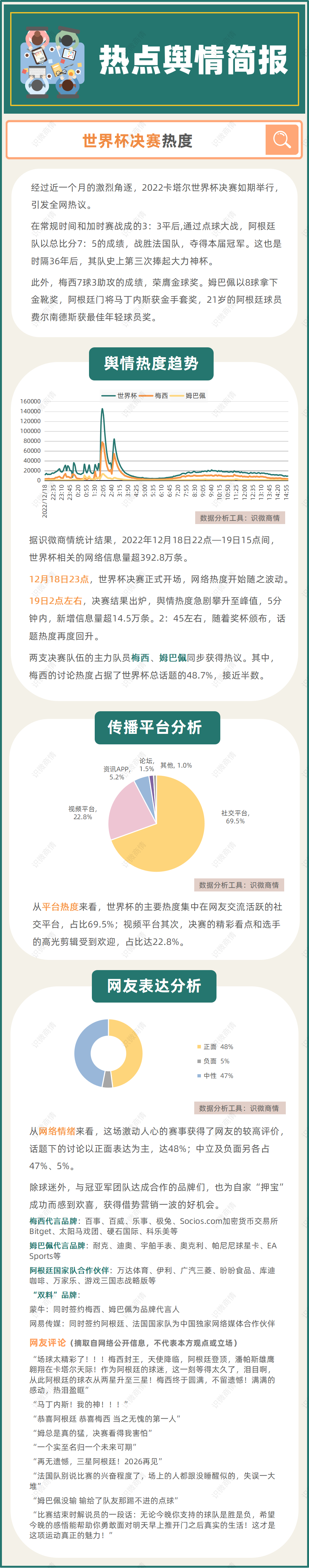 据识微商情舆情监测系统统计结果,2022年12月18日22点—19日15点间,世界杯相关的网络信息量超392.8万条。