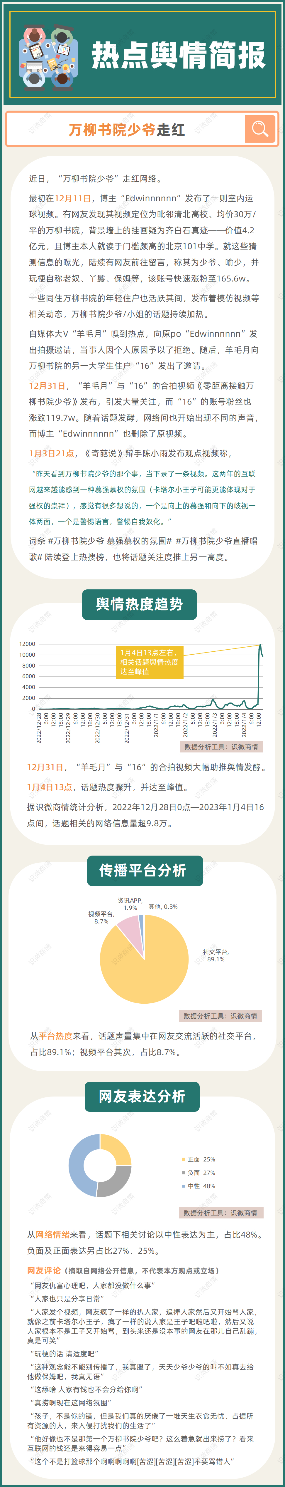 据识微商情舆情监测系统分析,2022年12月28日0点—2023年1月4日16点间,话题相关的网络信息量超9.8万。话题下相关讨论以中性表达为主,占比48%。负面及正面表达另占比27%、25%。