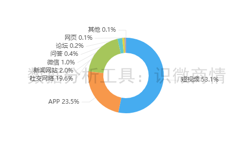 该时段内,有关“奇瑞汽车挑战天门山事件”的舆情主要集中在短视频平台,约占53.1%,其次为新闻APP(约占23.5%),社交网络(约占19.6%)。