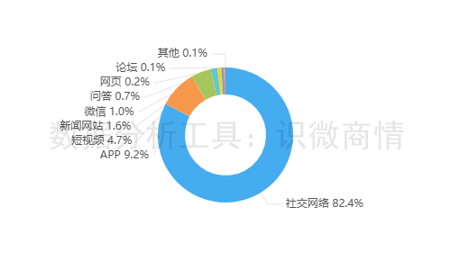 该时段内,有关“三只松鼠鼠名文化争议事件”的舆情主要集中在社交网络平台,约占82.4%,其次为新闻APP(约占9.2%),短视频(约占4.7%)。
