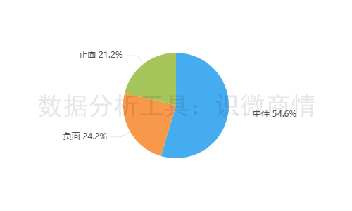 该时段内,有关“三只松鼠鼠名文化争议事件”的舆情情感倾向以中性为主,占54.6%;其次为负面舆情,占24.2%。正面舆情较少,占21.2%。