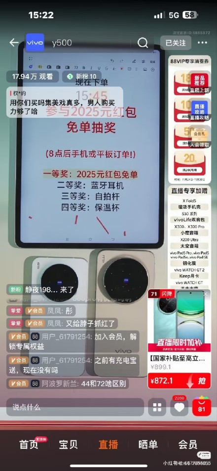 11月29日,vivo官方直播间在一场常规产品直播中出现争议操作。两条带有性别歧视倾向的用户评论被置顶展示,内容分别为“用你们买吗集美戏真多,男人购买力够了哈”(15:22)和“不需要女用户哦,购买力太差”(19:39)。
