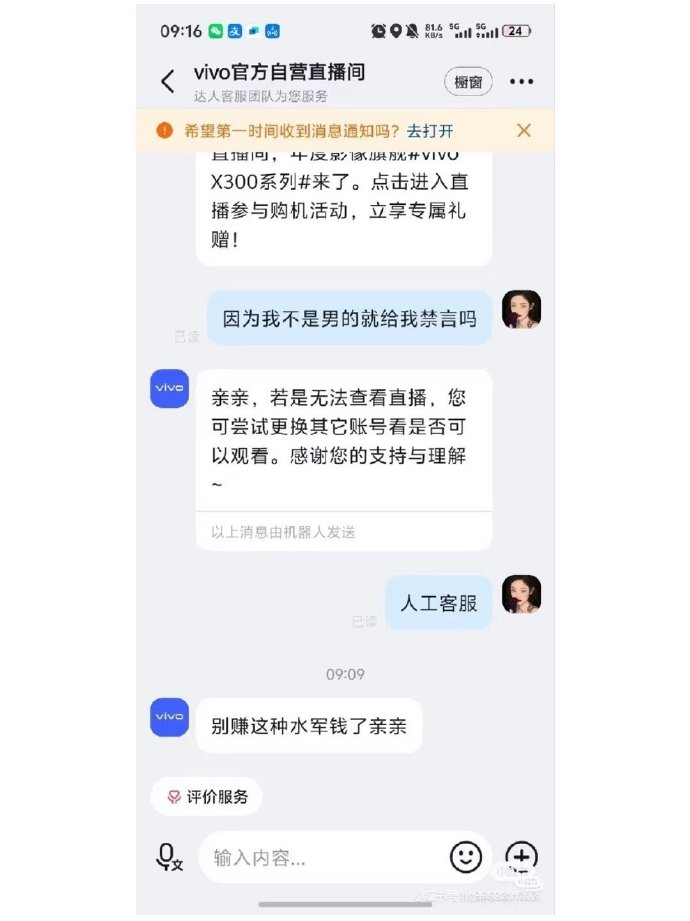 争议迅速蔓延至逍遥散人的商务合作领域。网易旗下《逆水寒》手游率先终止其赛事嘉宾合作;vivo因曾与逍遥散人存在商业推广合作关联,被网友纳入“狙击名单”,直播间提前遭遇大规模刷屏干扰,正常经营活动受影响,为后续置顶争议评论事件的爆发埋下伏笔。vivo客服在事件发酵后回应称“目前与逍遥散人无合作关系”,但未否认过往合作事实。