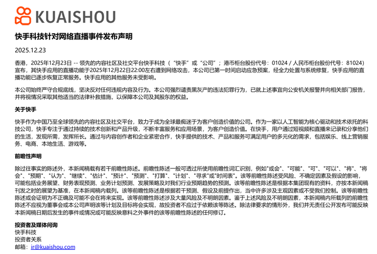 “快手应用的直播功能于2025年12月22日22:00左右遭到网络攻击。本公司已第一时间启动应急预案,经全力处置与系统修复,直播功能已逐步恢复正常服务。公司始终严守合规底线,坚决反对任何违规内容及行为。本公司强烈谴责黑灰产的违法犯罪行为,已就上述事宜向公安机关报警并向相关部门报告,并将视情况采取其他适当的法律补救措施。”