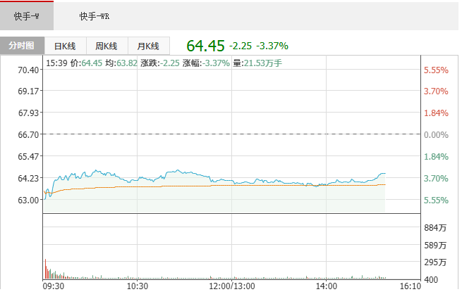 12月23日早盘,快手-W低开3.30%,报64.5港元/股,盘中一度跌近6%。