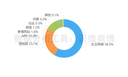该时段内,有关“快手遭到黑灰产攻击事件”的舆情主要集中在社交网络平台,约占58.5%,其次为短视频(约占25.1%),新闻APP(约占13.0%)。