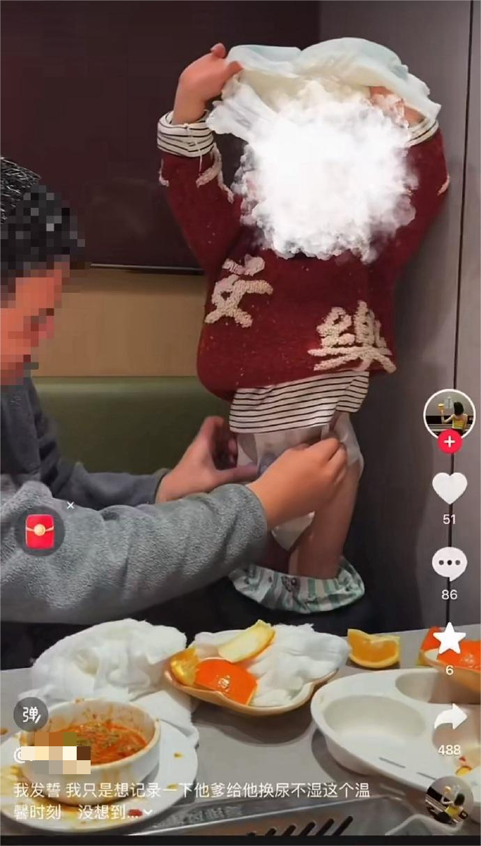 另一名家长当时正举着手机拍摄“孩子父亲首次给宝宝换纸尿裤”的画面,完整记录下纸尿裤被扔进火锅的过程。