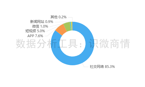 该时段内,有关“海底捞锅里被扔尿布事件”的舆情主要集中在社交网络平台,约占85.3%,其次为新闻APP(约占7.6%),短视频(约占5.0%)。