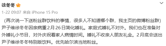 1月22日,徐冬冬发文解释送粉丝群饮料一事,表示优先哈尔滨当地粉丝。