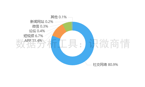 该时段内,有关“椰树推徐冬冬婚礼限定款”的舆情主要集中在社交网络平台,约占80.9%,其次为新闻APP(约占11.4%),短视频(约占6.7%)。