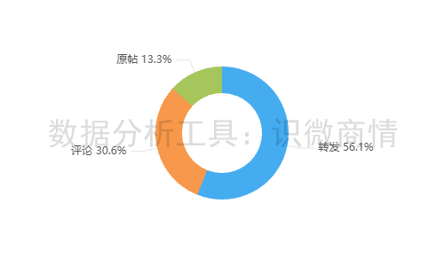 该段时间内,有关“椰树推徐冬冬婚礼限定款”的舆情信息类型以转发为主,占56.1%;其次为评论,占30.6%;原帖较少,占13.3%。