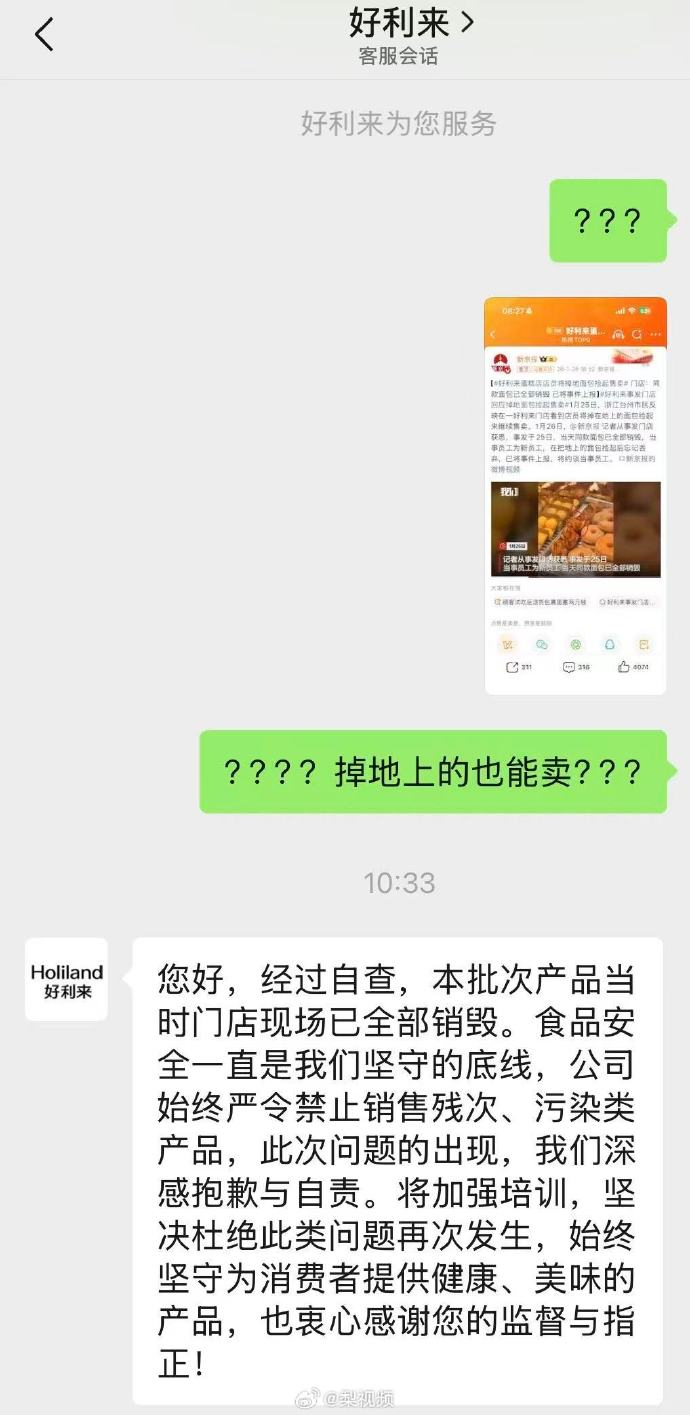 1月27日,好利来官方小程序客服向媒体及消费者致歉,强调“食品安全是坚守的底线”,公司严令禁止销售残次、污染类产品,对此次事件深感自责。官方承诺将加强全体员工的食品安全培训,完善管理流程,坚决杜绝类似问题重演,同时证实涉事批次产品已现场全部销毁。