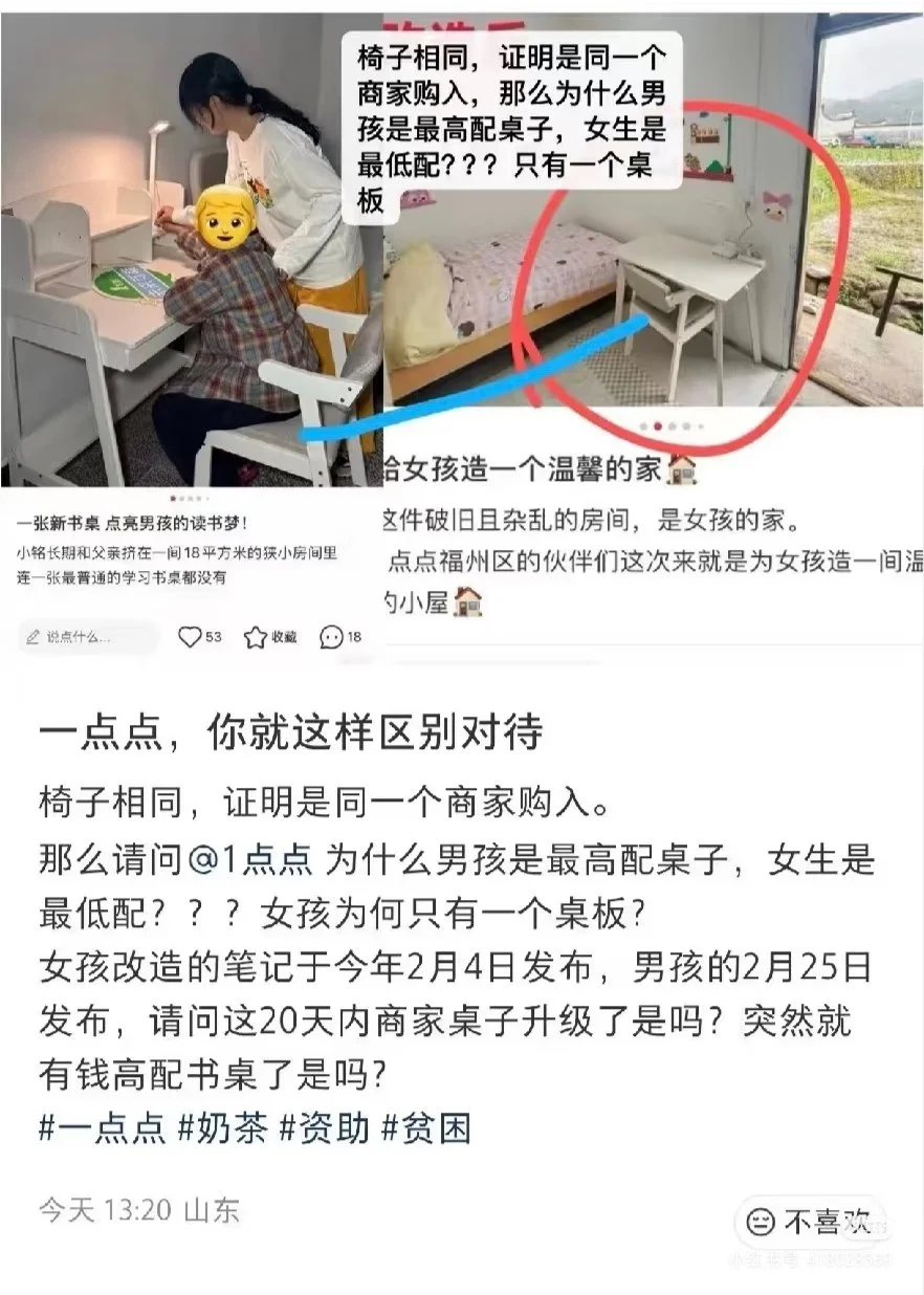 还有网友指出资助女童和男童的配置不一致,引发区别对待的质疑。