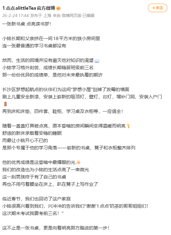 2026年2月24日,知名连锁奶茶品牌一点点在社交媒体上发布标题《一张新书桌点亮男孩的读书梦!》公益图文,称帮扶长沙低保户男孩小铭(化名)改造18㎡居住空间、粉刷墙面、添置书桌、赠送书籍,传递品牌公益形象。