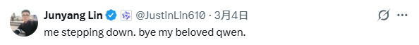 2026年3月4日00:11,林俊旸在X平台(个人账号)发文官宣离职:“mesteppingdown.byemybelovedqwen.”(我卸任了,再见了我亲爱的千问)。