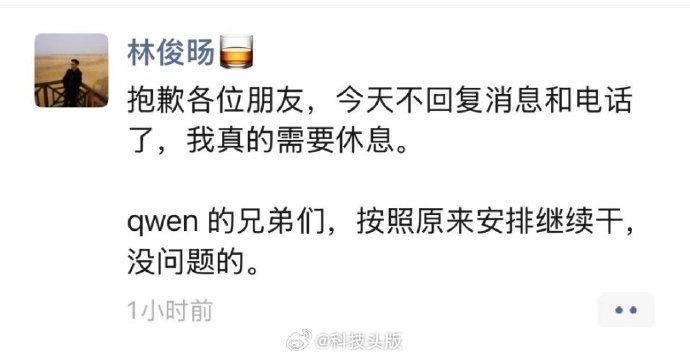 14:00:林俊旸发微信朋友圈,“抱歉各位朋友,今天不回复消息和电话了,我真的需要休息。Qwen的兄弟们,按照原来安排继续干,没问题的。”
