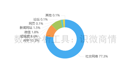 该时段内,有关“海河牛奶直播间涉低俗言行事件”的舆情主要集中在社交网络平台,约占77.3%,其次为新闻APP(约占10.5%),短视频(约占8.6%)。