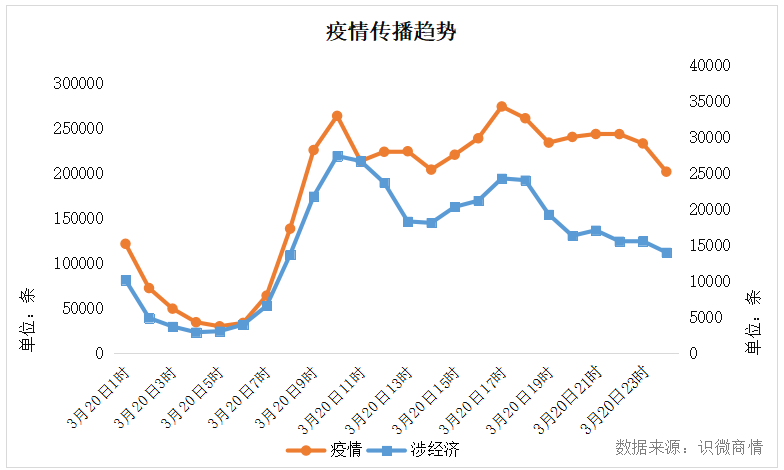 3月20日,全网有关“疫情”的信息总量为4287335条,较3月19日环比上涨11.6%。其中,涉及“经济”的相关信息总量为372394条,环比下降8%。3月20日,中共中央政治局常委、国务院总理、中央应对新冠肺炎疫情工作领导小组组长李克强考察疫情防控与生活物资保障服务、复工复产推进工作、宏观政策协调实施等情况,引发舆论广泛关注。其次,随着湖北地区疫情形势逐渐好转,对武汉城市设施的消毒工作也在逐步进行,“武汉汉口火车站今日全面消杀”等相关话题引发媒体网民热议。此外,国外疫情形势严峻,中国对其他国家的援助动态也成舆论关注重点,“中国已宣布向82个国家和国际组织提供援助”等话题引发网民热议。