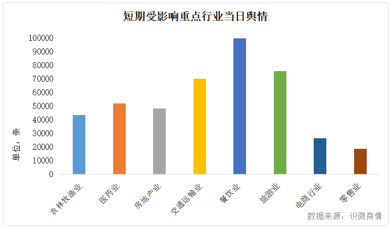 疫情相关信息中,餐饮业相关信息量处于高位,共计100352条(环比上涨0.2%);其次是旅游业(75784条,环比上涨1.7%)和交通运输业(70473条,环比下降9%)。相较于3月23日,在信息量排名方面,餐饮业仍为第一、旅游业升至第二、交通运输业降至第三。