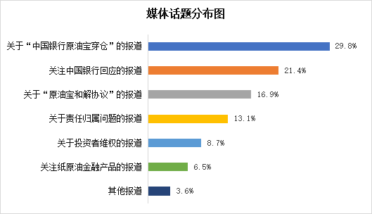 在“中国银行原油宝事件”的相关信息中,媒体主要对事件本身进行报道传播,占比29.8%。事件曝光后,涉事方中国银行就此事做出多次回应,引起“中国新闻网”“财新网”等多家媒体关注,相关报道占比21.4%。5月11日,中行APP推出原油宝线上和解协议,并设置了倒计时。“原油宝和解协议”成为媒体报道重点,占比为16.9%。关于责任归属问题的报道占比13.1%,相关内容主要从原油宝交易流程及协议内容等方面切入,对“谁该为损失负责”这一问题进行了介绍解答,如“南方周末”文章《中行原油宝:谁该背这个巨亏的锅?》、“新京报”文章《原油宝穿仓惨案:谁该为投资者的损失负责》等。事件发生后,有投资者表示将进行维权,引起部分媒体的关注,相关报道占比8.7%。此外,还有与原油宝此类纸原油金融产品相关的媒体报道,内容主要为对这一产品交易原理的介绍、产品投资者身份的统计报道等,占比为6.5%。