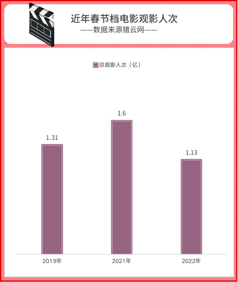 一边是票价涨了不少,另一边是春节走进电影院的观众在变少。2019年,春节档观影人次1.31亿,2021年有1.6亿,而到了2022年,直接跌到了1.13亿,下跌了近30%。