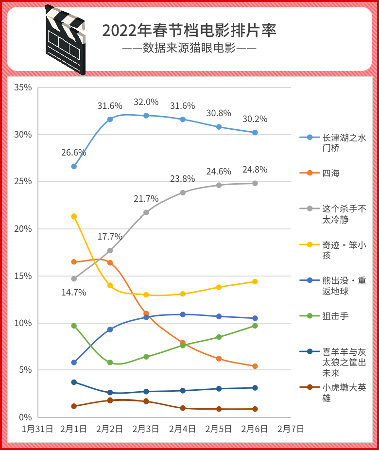 作为春节档电影市场的“中流砥柱”,《长津湖之水门桥》每日排片率和票房一样也是遥遥领先的,2月2日-6日,排片率均在30%以上。