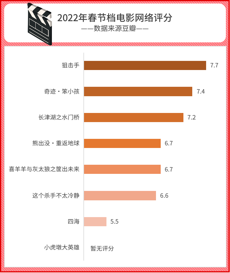 2022年的春节档没有出现8分以上高分高口碑影片,目前网络评分最高的电影为《狙击手》,7.7分。高票房的《长津湖之水门桥》评分7.2。