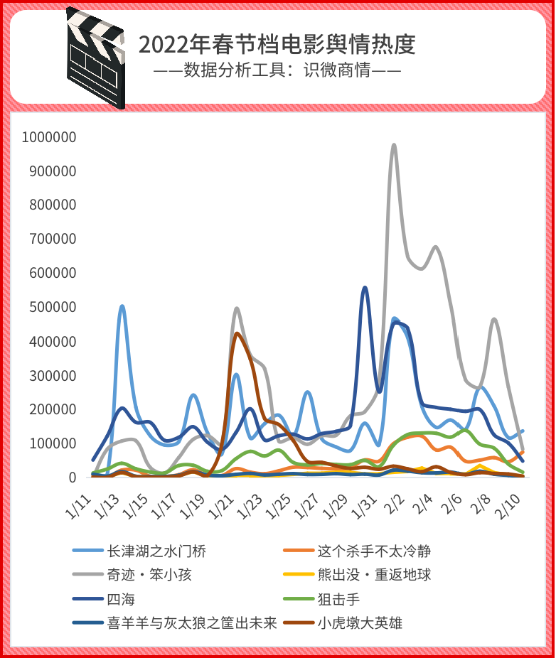 从近一个月数据(1月11日0时至2月10日下午17时)来看,总舆情热度值最高的是易烊千玺主演的《奇迹·笨小孩》,其次是《四海》、《长津湖之水门桥》。动画电影《喜羊羊与灰太狼之筐出未来》、《小虎墩大英雄》不仅票房、排片等不能“打”,热度也在底层。