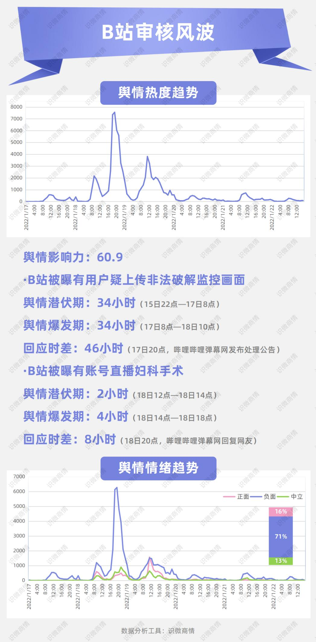 一波未平一波又起,18日12点,网友发帖爆料B站有账号直播妇科手术。相较与首轮风波长达34小时的舆情潜伏期与爆发期,该事件在前事的铺垫下快速引发关注,舆情潜伏期与爆发期仅达2小时与4小时。