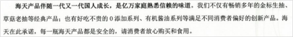 而从海天第一封“严正声明”的行文、篇幅、字体加粗,和舆情反应来看,大众明显能感知到其重点放在了品牌被恶意抹黑。至于舆论疑虑,海天也有提及,但多是运用了带有长长法规名和煽情形容词的套话,掺在整篇声明里就略显含糊了。